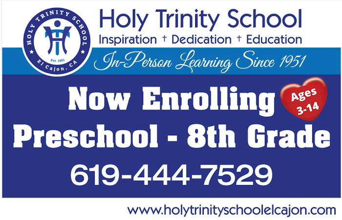 Holy Trinity School is a private, Catholic school located in El Cajon, California, serving approximately 200 students from pre-K through eighth grade. Christ is the reason for this school.